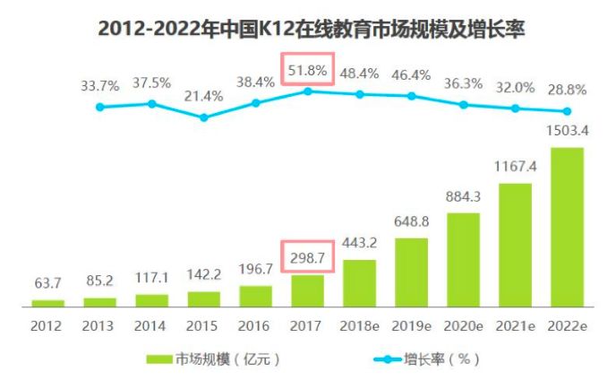 蛋糕够大:在整个教育行业中,除了与部分高等学校达成的“慕课”式推广外,鲜有能插手到学校教育中的企业,在线教育的核心根据地还是K12。而中国K12在线教育市场规模目前呈现出一个巨额增长的态势,在2017年甚至达到51.8%。