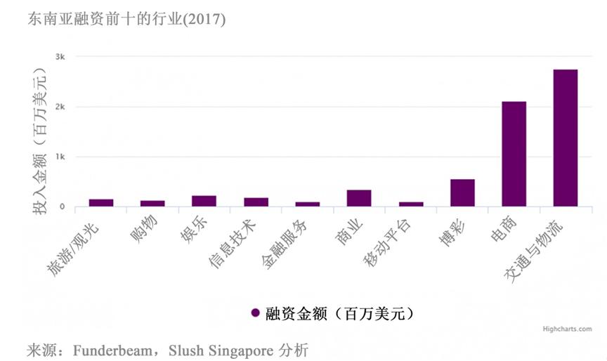 就投资领域而言,投资人对于东南亚地区的电商和物流业务押注颇高,去年总融资金额中75%都属于这两个领域。一个最明显的事例是印尼电商巨头 Tokopedia 获得中国电商巨头阿里巴巴11亿美元的投资。