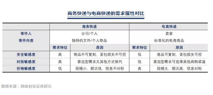 商务快递以服务品牌为无形资产,在高安全敏感、高时效敏感的需求面前,具有差异化的获客能力。同时,为满足安全和时效所投入的品牌成本、固定资产、运营冗余所带来的高成本,可以被低价格敏感度的需求所接受。