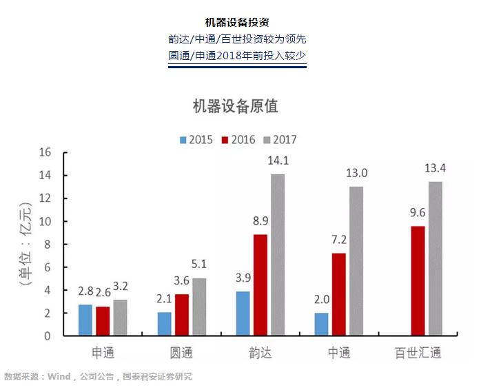 电商快递企业创立初期选择了在“轻资产、加盟制”模式,固定资产投资规模较小。2016年纷纷上市以来,我们观察到电商快递企业加大投资,“由轻变重”。
