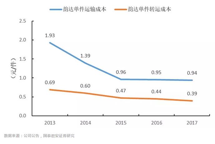 以韵达为例,2013年至2017年,业务量由11亿件增长至47亿件,单件干线运输成本由1.93元下降至0.94元,单件转运成本由0.69元下降至0.39元。