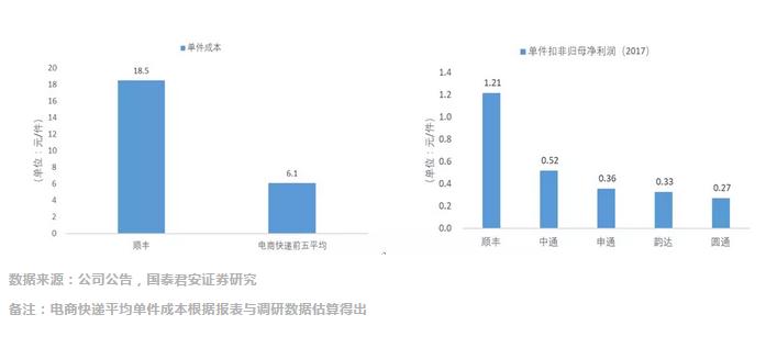 2. 成本利润:高成本的稳定服务创造了差异化的品牌,品牌带来较高的定价与单件利润。顺丰的单件成本是电商快递平均单件成本的3倍以上,但其单件扣非归母净利润也是电商快递企业的2-4倍。