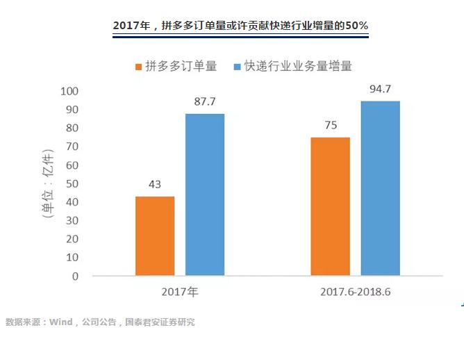 成立仅两年的2017年,拼多多订单量已占快递行业增量的50%。考虑到部分取消订单、平台间的互相渗透订单,50%大概有所高估,但毋庸置疑的是,拼多多为2017-18年的快递市场贡献了极为重要的增量。