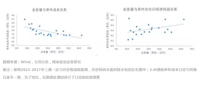 各家快递上市时间不长,我们利用有限的数据做出两张散点图:业务量规模与单件成本、单件利润的关系。