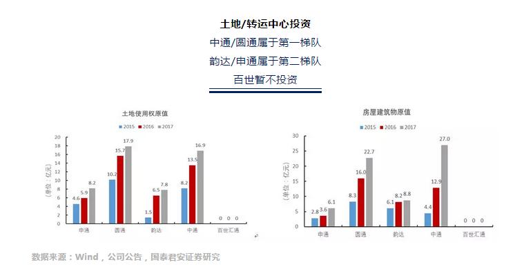 各家企业过去数年投资侧重点的不同,也许是步骤选择上的差异,或者是业务逻辑判断的差异。总体来看,上市后的两年中,中通的投资力度全面领先,圆通重点投资土地与转运中心,韵达重点投车辆与自动化,申通重点投土地与车辆,百世重点投资自动化。