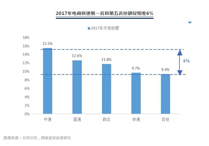 2017年,五大民营上市电商快递公司业务量占全行业(电商快递+商务快递)的60%。但五家公司中,第一名中通与第五名百世的市场份额相差仅6%。加上未上市的邮政与EMS,春秋六国确立。