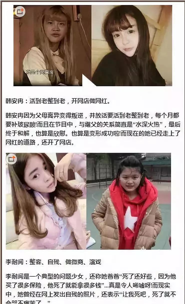 而“铁骨铮铮王境泽,一碗炒饭能叛国”只是《变形计》网红队伍中的一员,“变形计网红”的队伍中,还有那个沉迷整容的富家女韩安冉。
