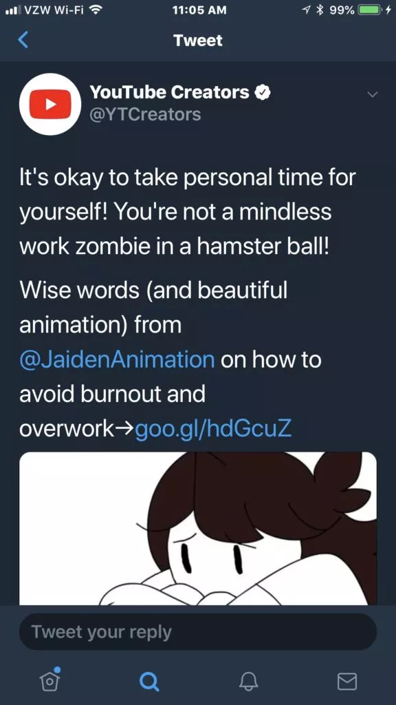 一名 YouTube 发言人回复 Katherine 称,“骚扰有错。我们平台有相关政策来阻挡骚扰和网络暴力。工作人员会审核举报内容,也会根据政策移除不适合的视频”。对于博主们的精神崩溃,YouTube 方面当然鼓励他们休假,像普通上班族一样享受夜晚、周末和假期。而对于博主们的压力,YouTube 也说,“我们希望博主能公开讨论他们的压力。”