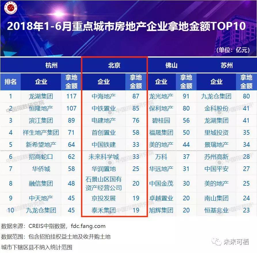 (2018年上半年北京房企拿地金额TOP 10 当中,除了排在末尾的泰禾,都是国资背景。)