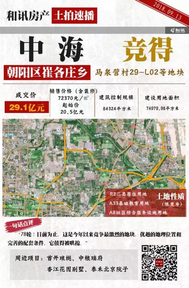 中海以29.1亿元总价夺得朝阳区崔各庄限竞房地块,溢价率41.9%。