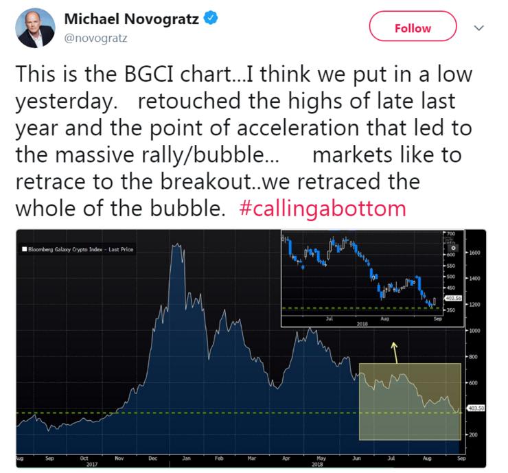 9 月 13 日,银河数字资本管理公司 CEO Michael Novogratz 发推称,加密货币价格已触底。
