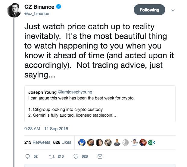 近日,中国币圈大佬赵长鹏也频频表示看好加密货币市场。9 月 11 日,分析师 Joseph Young 称本周加密市场利好信号最强。赵长鹏则对其言论转发评论称:加密货币的价格将会反映这一现实。