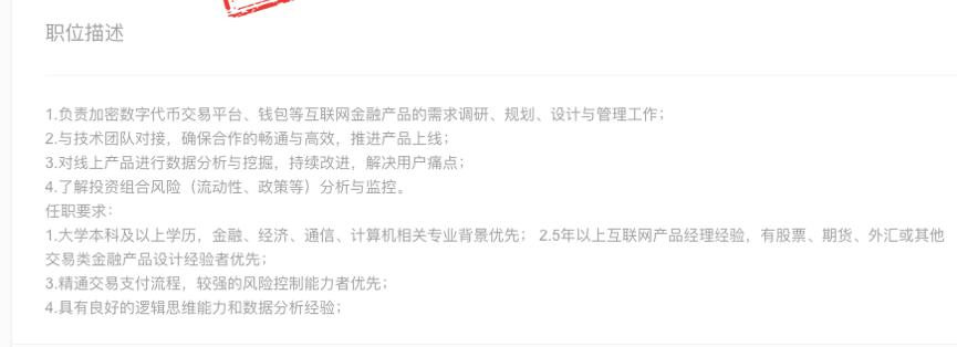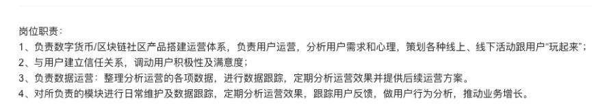 而火币等其他交易所运营经理的岗位则一般描述为用户关系经营、数据、活动等。