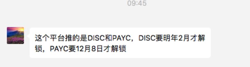 另外,讲师所推荐的币种如 DISC 和 PAYC 在全网的信息极少,在非小号等平台上也找不到详细信息,而其解仓最早要等到今年年底 。
