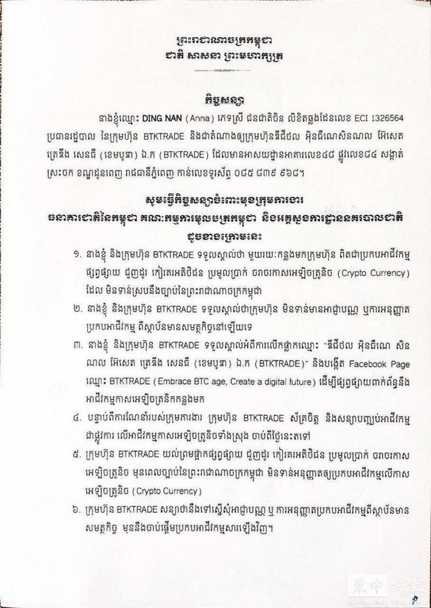 据保证书内容,BTK 承认公司在 the Kingdom of Cambodia 的加密货币发行、交易和集资活动,违反了 the Kingdom of Cambodia 法律,承认公司是在没有获得相关部门批发营业执照和许可证情况下开展营业的。丁女士在保证书上强调 BTK 愿意在保证书签发日期起全面停业。