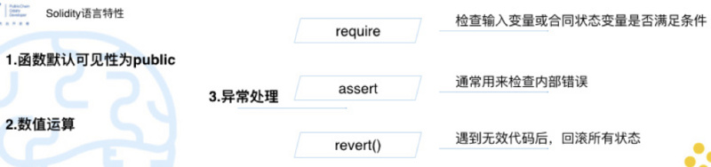 第三个是设计三种异常处理方式,require、assert 或者 revert 这三种。它们各有区别,require 一般是写在函数前面,用来检查输入的变量和合作状态变量是否满足条件,如果满足条件的话才会去执行。assert 这个函数,从开发者角度会写在函数的尾部,用来检查函数的内部错误,如果出现错误就会强制停止。revert 函数更特殊一些,遇到一些无效代码,会回滚之前所有的状态。这三个函数还有一个区别,revert 可以返回,合约如果没有执行的话,这个 gas 是不需要付的。