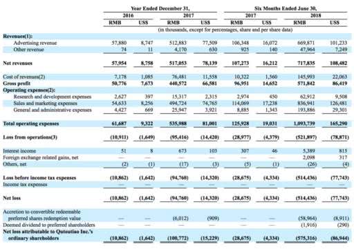 ·2018年上半年公司趣头条营收为7.18亿元,上一年同期为1.07亿元;上半年公司的亏损为5.14亿元,上一年同期为2.87亿元。就上半年而言,来自广告的收入为6.70亿元,占总收入的比重达到93.31%。