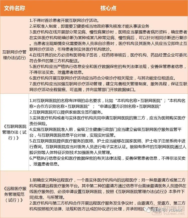 此次一共颁布了3个文件,即《 互联网诊疗管理办法》、《互联网医院管理办法》、《远程医疗服务管理规范》,其核心点如图所示: