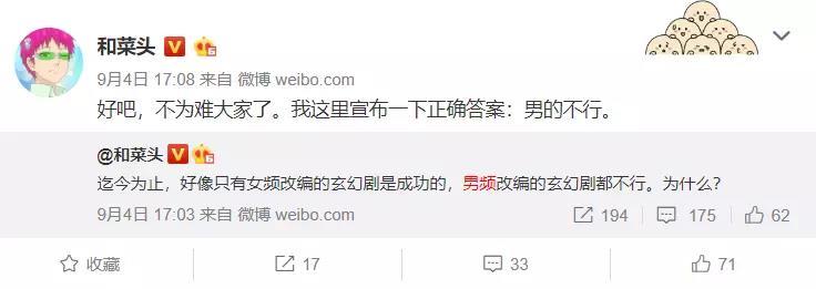 “因为男的不爱追剧,都喜欢打游戏。”“因为男频的后宫太多,总有点不尊重女性的意味,打怪升级也不容易让女性有代入感。”很快就有人回复了,讨论大多围绕着性别差异进行。五分钟后,和菜头自己终结了这个话题,“男的不行”。