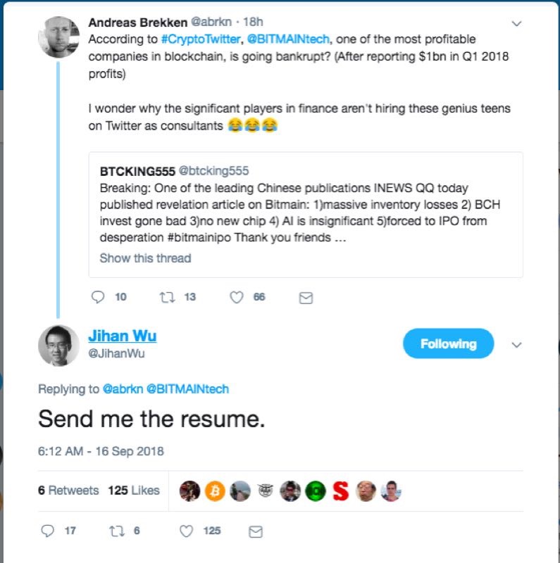 推特网友问比特大陆会否破产?吴忌寒回复:兄弟,把简历寄过来