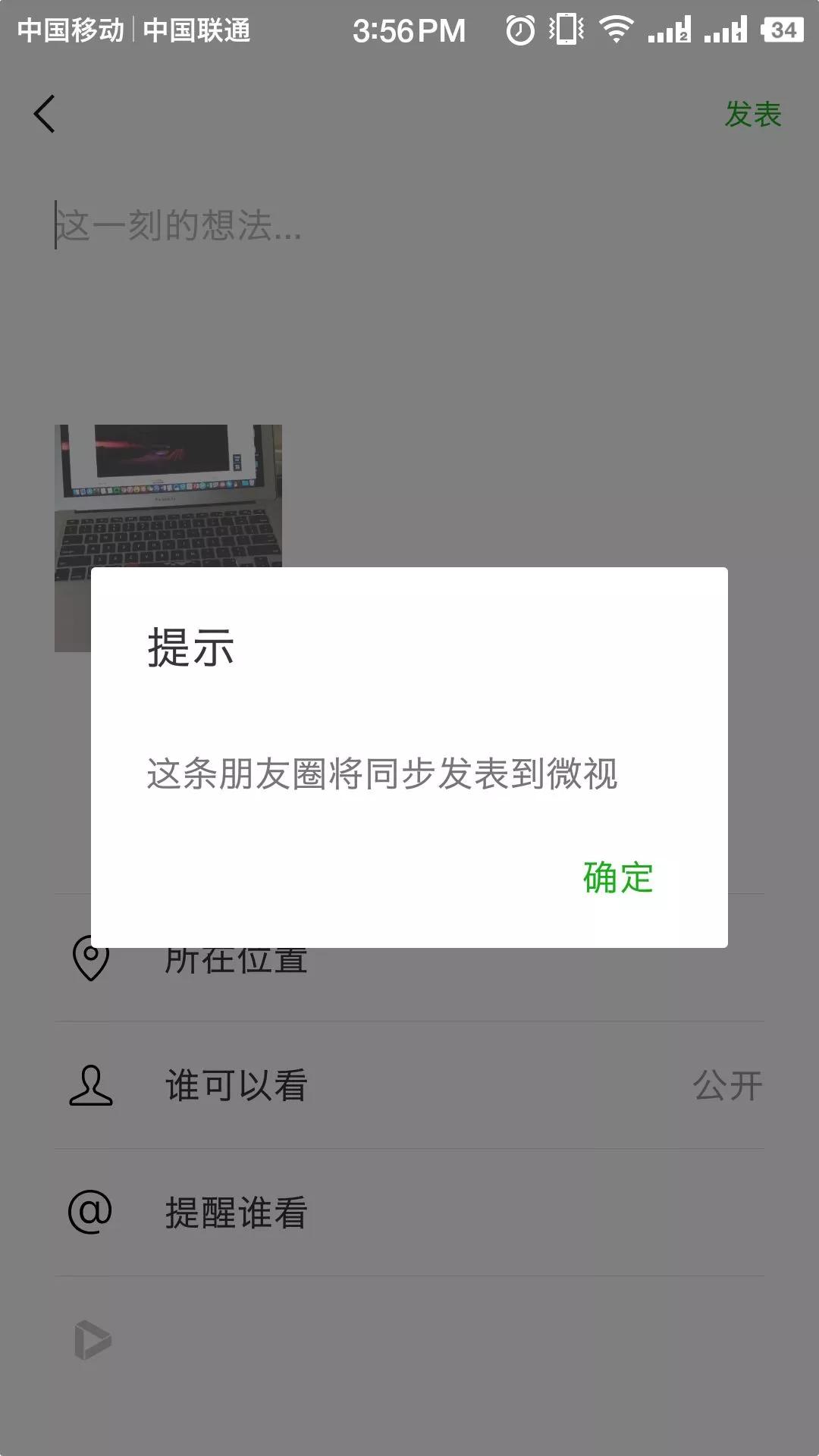 又过了几日,至5月下旬,微信曾经短暂灰度测试过一个功能,试图将用户在朋友圈拍摄的视频同步到微视中来,而且这个同步是强制性的——只要你发的不是仅自己可见的视频,就要同步到微视上。简言之,这仍然是一次为微视导流的尝试。
