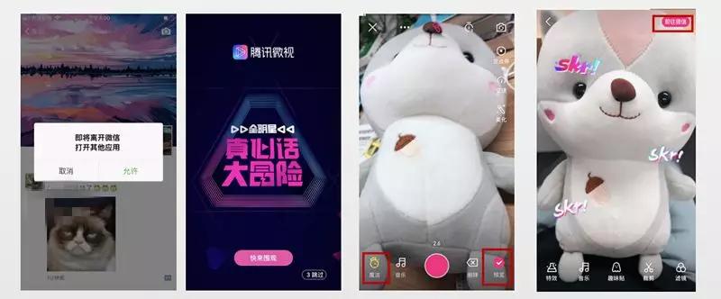 于是我迅速点击进去看了看,就按照如下左一的页面,跳转到了微视产品内,随后进入拍摄页面。拍摄视频的过程中可以点击“魔法”(图三左下角)增加一些效果。完成拍摄之后无法直接跳回微信发布,需要点击“预览”(图三右下角),然后进入预览界面,之后点击“前往微信”,回到微信发布内容。