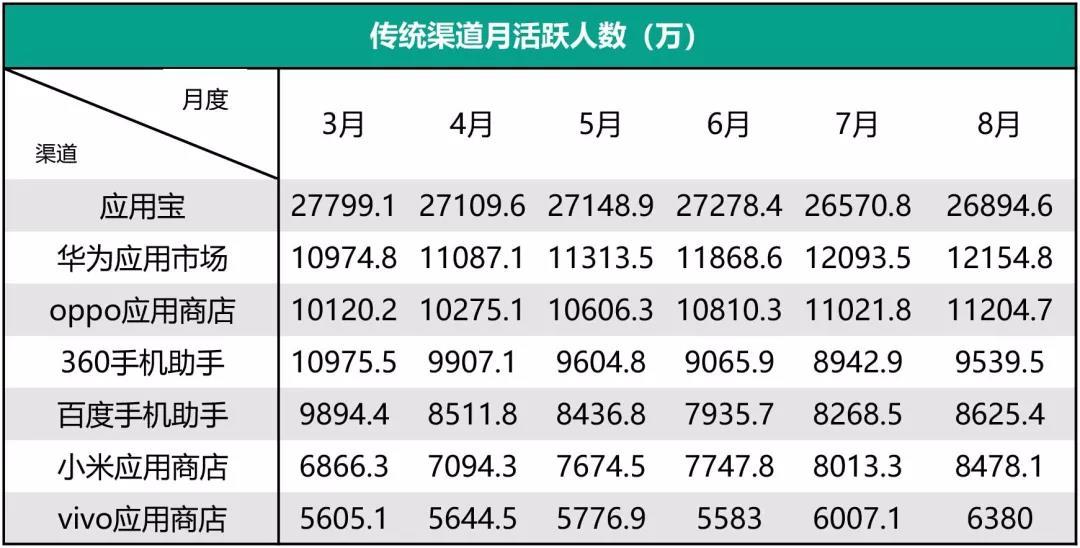 这也反映在各渠道的月活跃用户数走向上。手游那点事结合第三方发布的相关数据,今年3月份到8月份期间,应用宝MAU从2.78亿下滑至2.69亿,360手机助手以及百度手机助手均呈下滑趋势,仅在暑假的7月及8月有短暂上升。