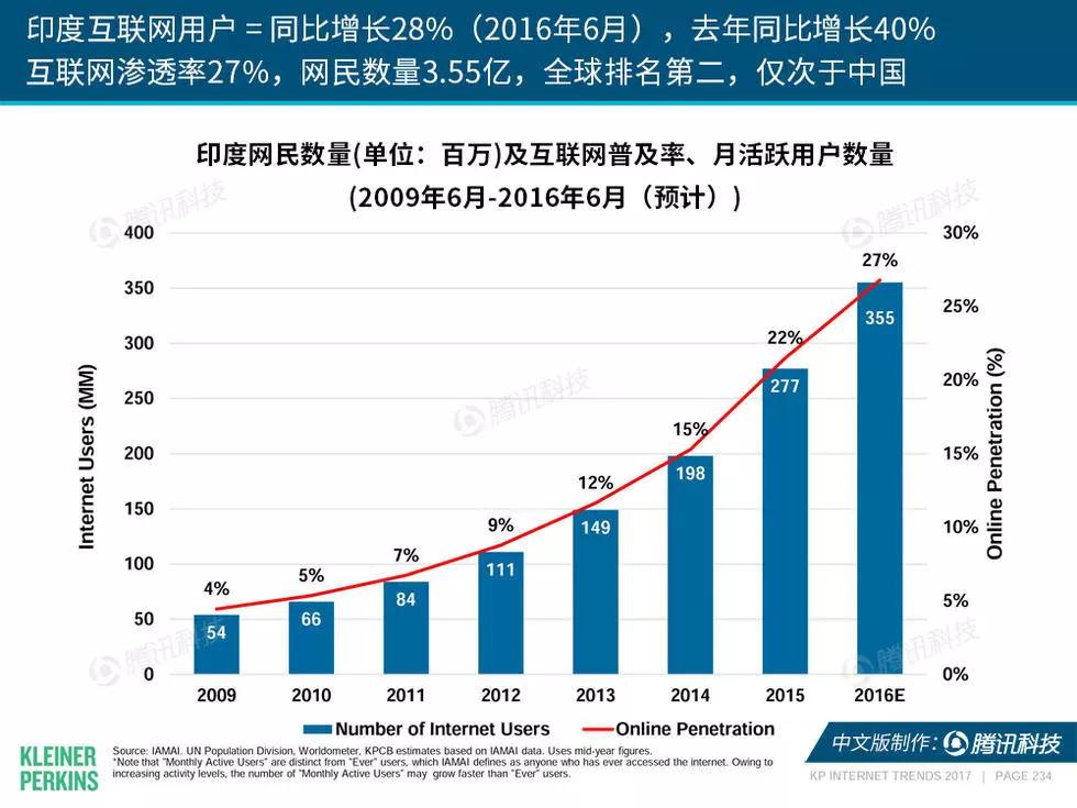 2017互联网趋势报告中,“互联网女皇”用了相当大篇幅介绍印度这个新兴市场。