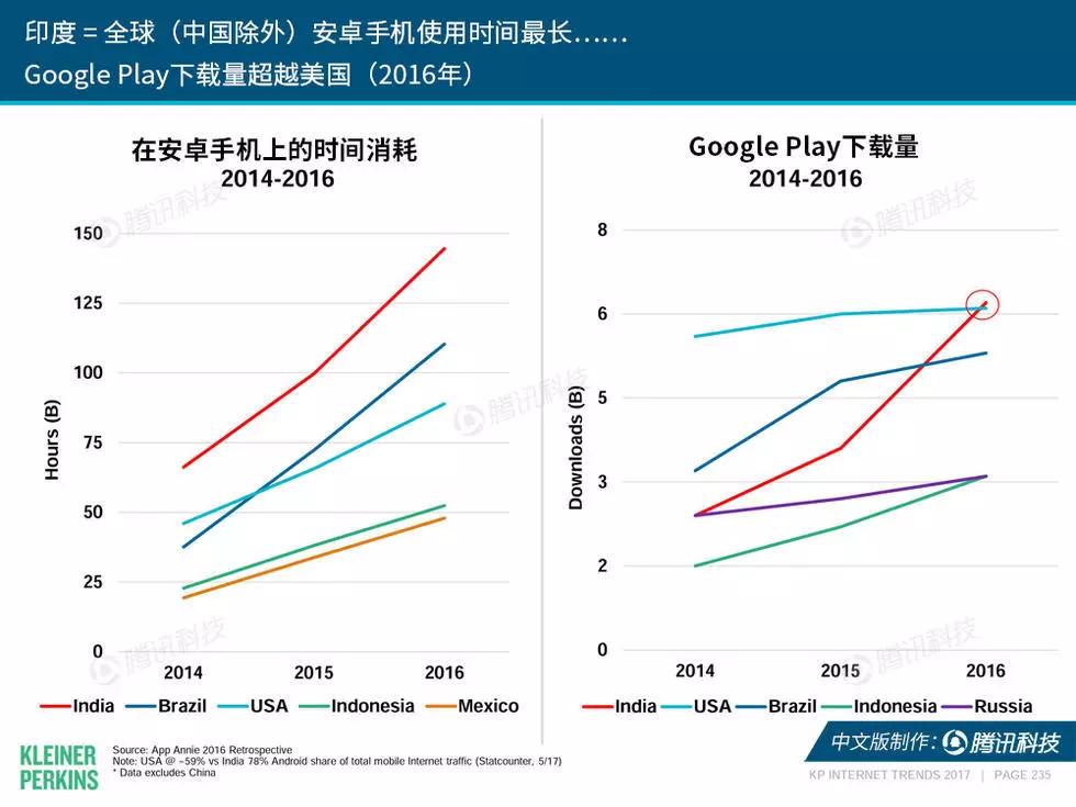 一是市场规模巨大。2016年的印度GDP增速为6.8%,为全球之冠,并超过了中国的6.7%。截止2016年6月,估计印度网民数量达3.55亿,互联网渗透率27%。印度的安卓机使用时长达1480亿小时(中国除外),居全球之首。印度的Google Play软件商店下载量也居全球第一,达62亿次,已经超过美国。