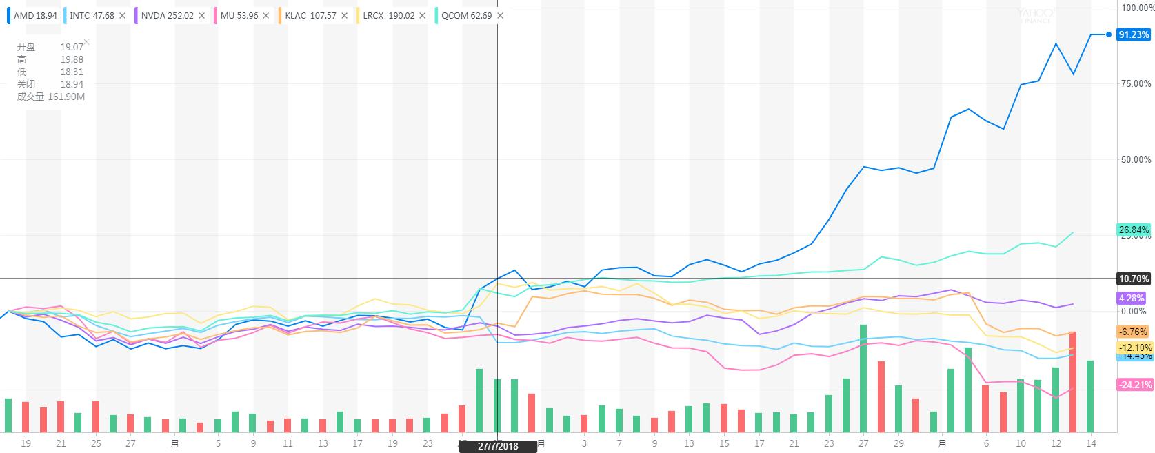 目前的情况,下结论说半导体整个转熊并不准确,芯片股只是出现了明显的分化,特定子行业如闪存出现了行业拐点,波及相关主要选手如英特尔和美光等,而GPU霸主英伟达、复兴的巨头AMD依然涨得一骑绝尘。