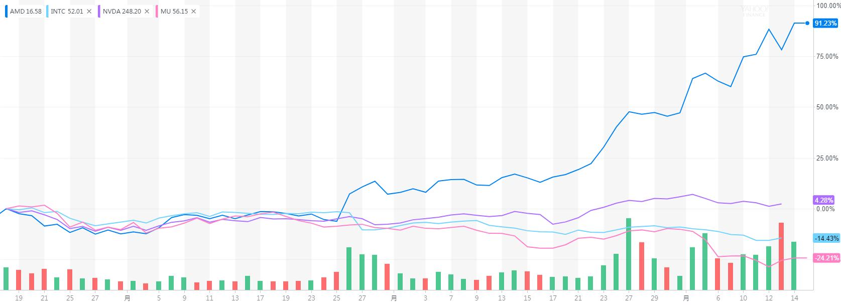 虽然比前期高点跌了20%+的美光和英特尔都陷入了技术熊市,但不等于整个半导体市场都掉头向下,从四巨头英伟达、AMD、英特尔、美光过去三个月的股价看,只是行业分化加剧了,传统细分板块陷入了衰退周期,而握住了“时代之钥”的主打新兴的AI相关芯片、为云服务器深度计算提供算力基础设施的英伟达AMD则明显一路往上前景一片大好。