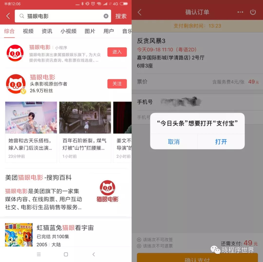 在猫眼电影的今日头条小程序上,晓程序世界实测发现,目前并不支持微信支付,且仅支持支付宝这一种付款形式。