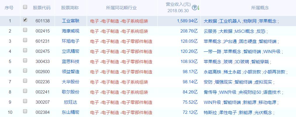 据同花顺电子制造行业分类统计,工业富联2018年上半年的营收规模比同行业第2名~第20名的同时期营收之和还要大。