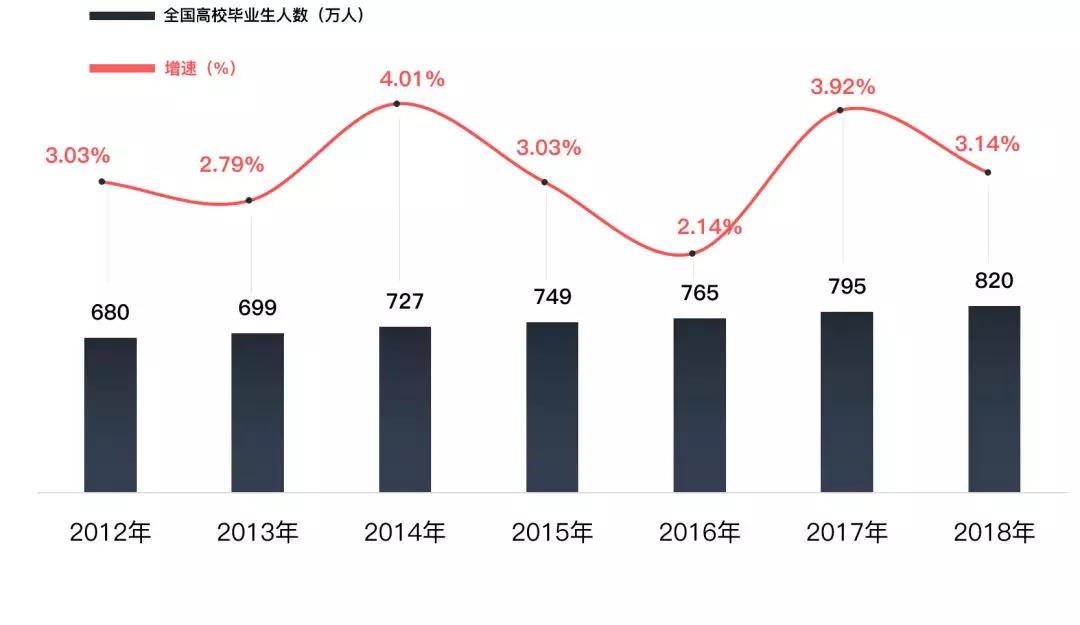 2012年至今,全国高校毕业生总人数持续增长,2018年比2012年多了140万应届毕业生,毕业生总人数高达820万人。根据人力资源和社会保障部的数据,近5年全国高校毕业生总体就业率均在90%以上。但在北上广深和部分新一线城市,人才扎堆,就业竞争依然激烈。