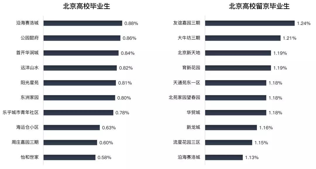 如前所述,从关注热门小区TOP10到居住热门小区TOP10,榜单发生了两个显著的变化:一是集中度显提高,二是分布区向北部迁移。在留京毕业生实际居住的小区中,可以看到互联网产业强大的影响力。10个热门小区中,有8个分布在西北旺、西三旗、回龙观、天通苑这类互联网企业辐射范围内的大型居住社区。