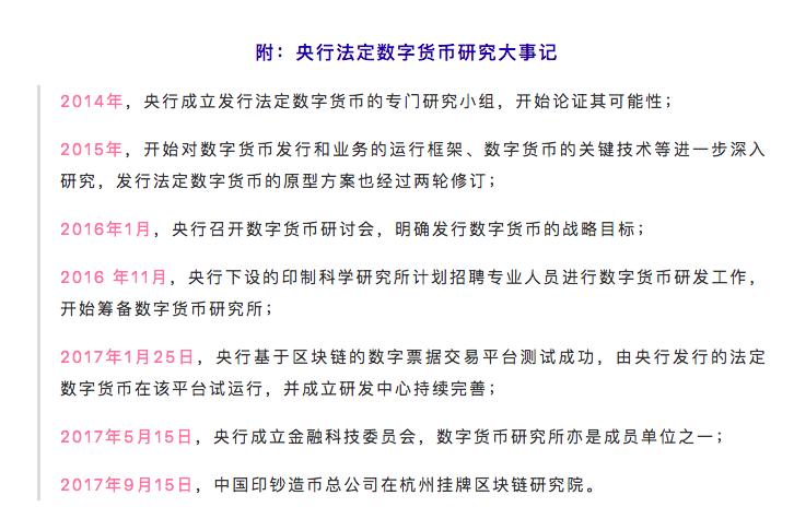 需要指出的是央行对法定数字货币的研发早在 2014 年就开始了。下面是一副行业研发法定数字货币的时间表: