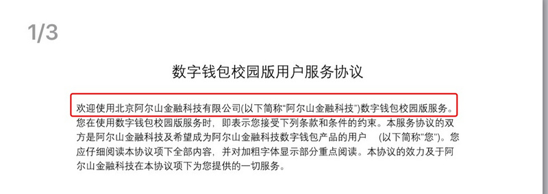 通过其服务协议可知,数字钱包(校园版)的服务提供商是北京阿尔山金融科技有限公司(简称阿尔山金融科技)。协议里说明,用户在创建、浏览、登录钱包时,所产生的个人信息、交易数据及其他数据信息都可被该公司获取。