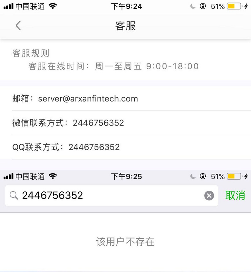既然都查了这么多,那得试用一下吧?于是我尝试绑定银行卡并注册我的钱包。神奇的是,我所使用的联通号码并不被系统接受。于是我尝试向该应用的客服人员联系,发现该系统提供的客服微信账号并不存在……