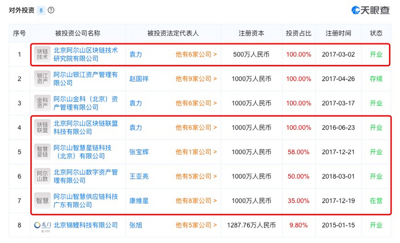 随后我查了一下这家公司的来头,发现“阿尔山”对外投资的 8 家公司中,5 个可能和区块链有关。公开资料显示,2017 年 8 月,阿尔山金融科技还与清华大学计算机系合作,成立了清华阿尔山区块链研究中心。不难看出,这家公司在区块链领域布局较早。