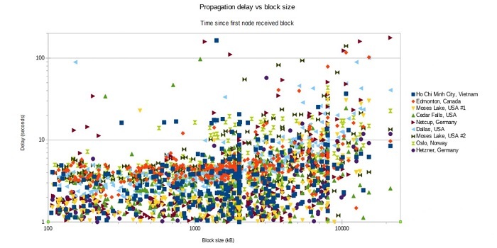 “在压力测试期间,区块通过中国外的主网 传播的速度大约是300–1000 kB/s。这是很慢的,如果区块频频大于8MB就会引发像孤块率这样的问题,除非我们改进区块传播算法。”