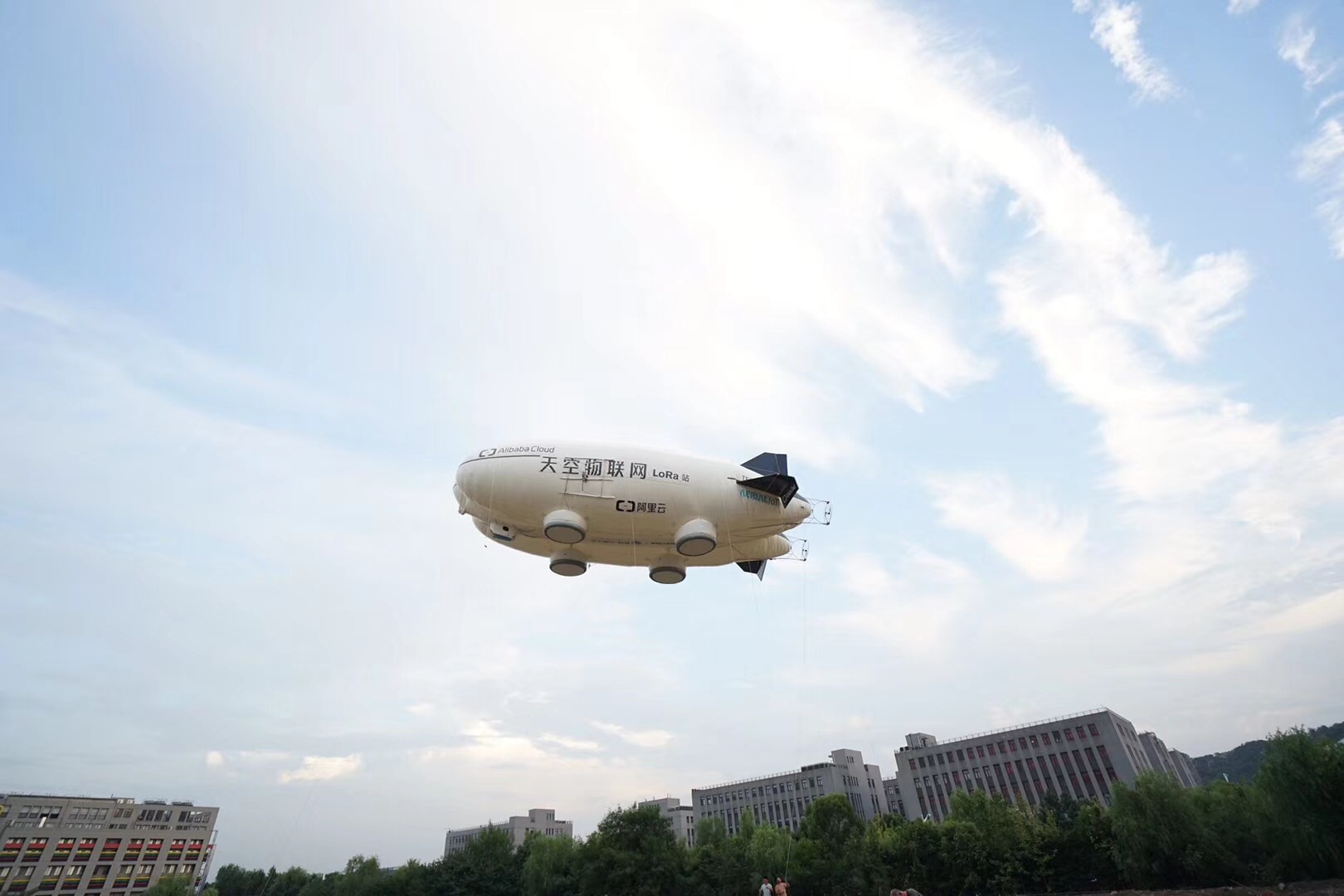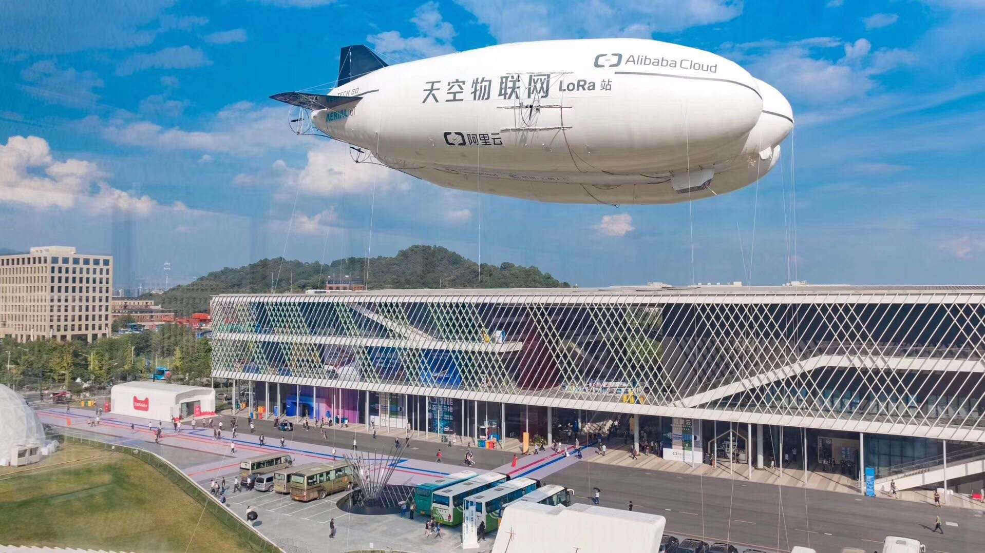 作为“达尔文计划”的一部分,阿里云展示了一架印有“天空物联网LoRa站”字样的飞艇。