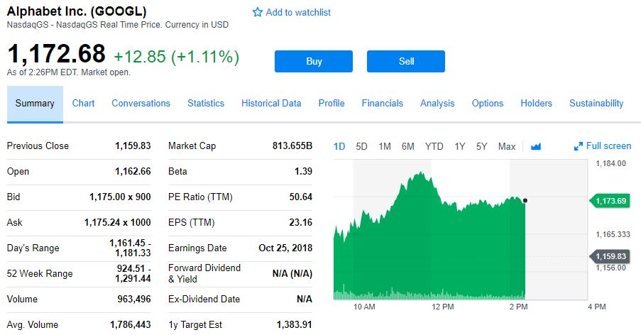 谷歌A类股周二涨超1%,日内最高触及1181美元,接近五日新高。