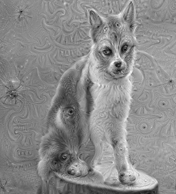 DeepDream的工程师Alexander Mordvintsev是在凌晨2点的时候开发出该程序的第一个迭代版本的,当时他因为做噩梦被惊醒了。他灌输给神经网络的第一幅图像是一只小猫坐在树桩上,输出是一头可怕的怪物:有很多双眼睛,脚上长着湿鼻子的猫狗混种。2012年,Google首次发布一个基于1000万随机YouTube视频的未经训练的分类器网络时,在没有任何提示的情况下它学会识别的第一个东西就是一张猫脸:这是互联网的灵兽。Mordvintsev的网络因此梦想出了它知道的东西,也就是更多的猫和狗。进一步的迭代产生耶罗尼米斯·博斯地狱逃亡式的无限结构,是被激活的神经元而定,里面有拱门、塔、桥等分形的层层推进。但DeepDream的创作自始至终有一点是不变的,那就是眼睛——狗的眼睛,猫的眼睛,人的眼睛;网络本身无所不在的时刻盯住你的眼睛。漂浮在DeepDream的天空中的眼睛让人想起了敌托邦宣传里面的全视之眼:Google自身的无意识,由我们的记忆和行动组成,被不断的分析处理,为了公司利润和私营情报而跟踪。DeepDream天生就是一台偏执狂机器,因为它出现的地方就是一个偏执狂世界。