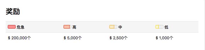 而运行在以太坊上的分布式投注平台 Augur 标价 20 万美元用来奖励修复危急漏洞,5000 美元用来奖励修复高风险漏洞。