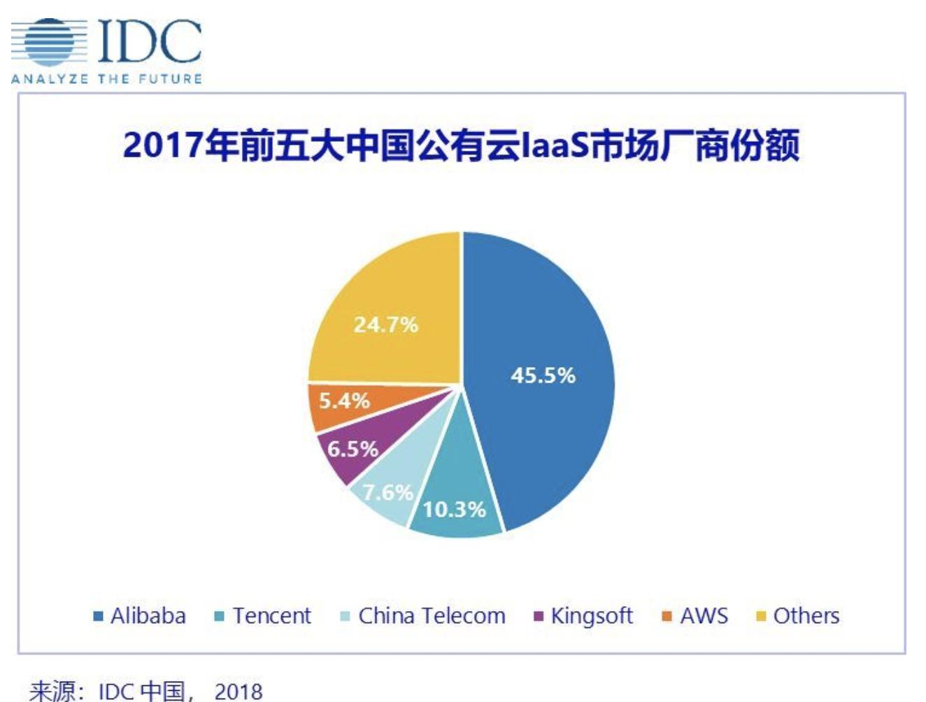 放在中国公有云市场来看,腾讯云占有的份额还尚小。IDC发布的2018上半年报告显示,阿里云以45.5%的份额排第一,腾讯云以10.3%的份额居第二。报告数据还显示,2017年中国公有云服务整体市场规模(IaaS/PaaS/SaaS)首次超过40亿美金,其中IaaS市场再创新高,增速达到72%。