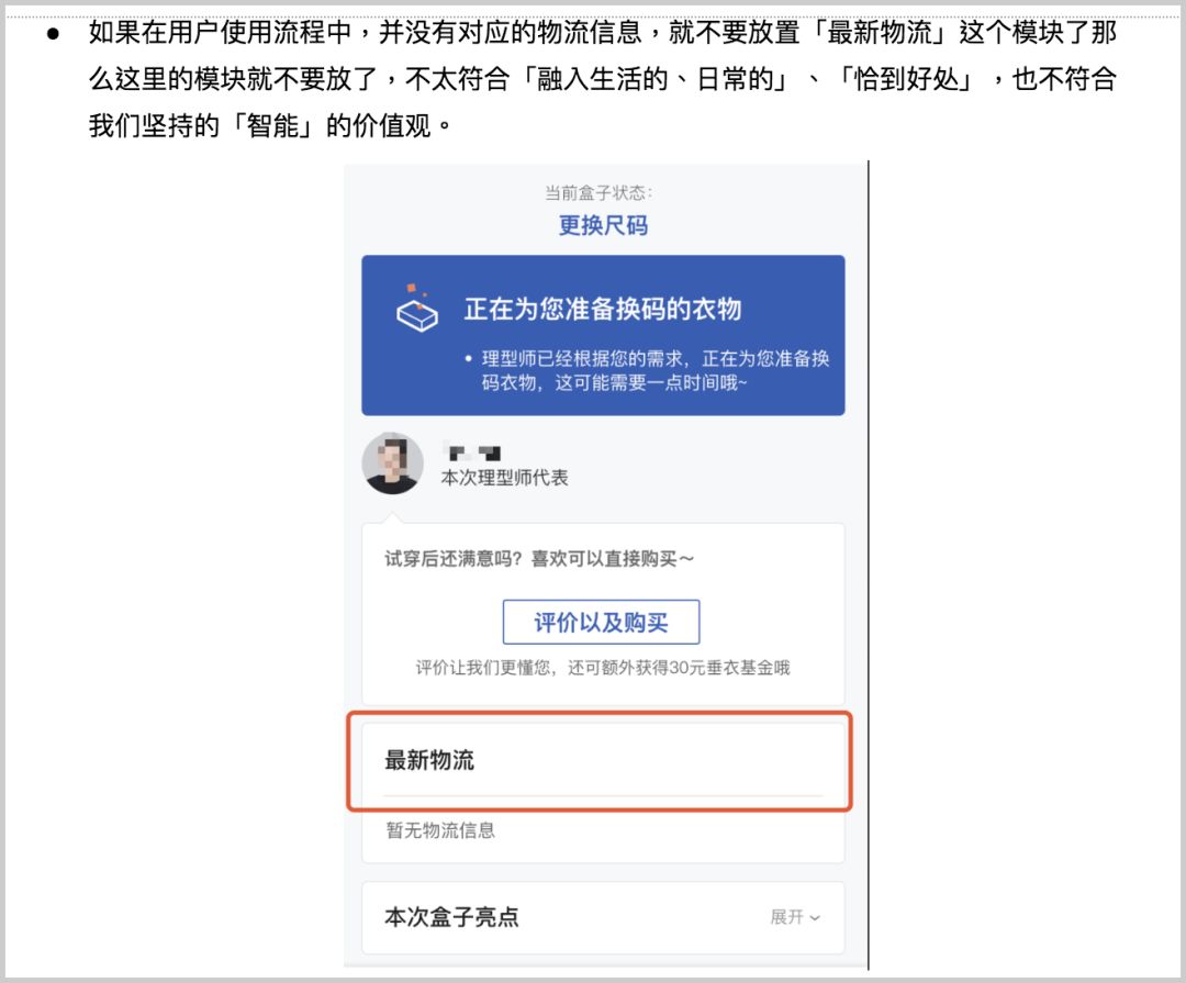 公司的 App 在用户退换货的页面显示了「最新物流」这样的模块。实际上,用户在进行到这一步时,是没有物流信息的。产品中包含这部分信息,只是因为它是电商产品的常规模块。「品牌手册」中限定产品/品牌做事情要「恰到好处」的贴近用户真实的生活场景,建议在没有物流信息时将「最新物流」信息的模块去掉。