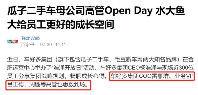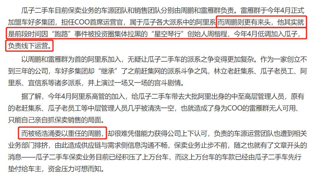 6月20日,在中国IT观察网一篇报道该平台内部派系斗争的文章中,提到,周楷程(周鹏)已担任瓜子二手车车源线下运营团队负责人,加入高管行列: