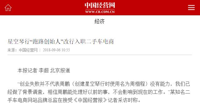 今年9月,据中国经营报报道,周楷程入职了知名“二手车电商平台” :