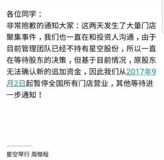 2017年9月2日,星空琴行一夜之间关闭全国60家门店,总部及客服电话均无人接听。