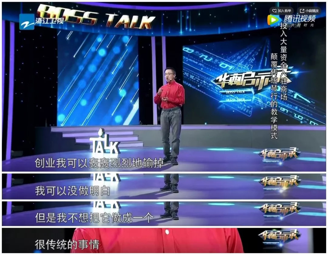 星空琴行创始人兼CEO周楷程,一身大红着装,出现在浙江卫视的舞台上,做了一段题为《敢于舍弃过去,才能快速成长》的演讲: